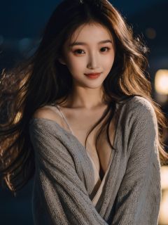 Best quality, high detail, ultra high resolution, true skin texture, original photo, highly realistic, night, dark shadow, low profile, cold light, an oriental girl, exquisite facial features, smile, white teeth, thin chain decoration, light color sweater, bust, breast beauty, hot figure, long and long hair, fluffy big wavy hairstyle, a lot of hair covering the chest, long legs, side, look at the camera. Full-body lens, depth of field, panoramic view
