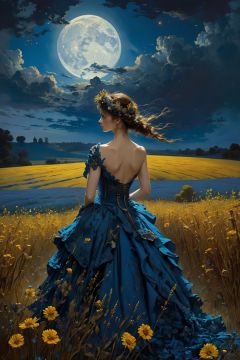 landscape by Gustave Moreau, Thomas Kinkade, James Gurney. Carne Griffiths. Frank Frazetta. van gogh, Alberto Sevesooil paint, masterpiece, Realistic, deep colors, blue tint, only bronze gold moon, night scenery, fields, Field, Intricate, detailed, sharp, clear, Better image quality, harsh brush strokes