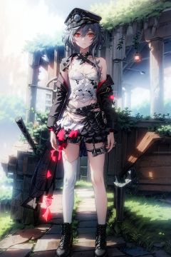 (masterpiece:1.3),(the best quality:1.2),(super fine illustrations:1.2),(Masterpiece),high quality,high detail,(white background:1.2),looking at viewer,(SOLO:1.4),outline,simple background,, boots,hat,senti,silver hair,hat flower,military uniform,military hat,thigh strap,grey hair,black jacket,peaked cap,hair between eyes,bare shoulders,jacket,off shoulder,black footwear,skirt,red eyes,thighhighs,