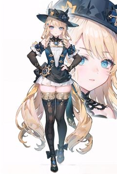 8k, best quality, masterpiece, (ultra-detailed:1.1), (high detailed skin), (full body:1.2), white background, standing, looking at viewer, solo, hand on hip, <lora:vny-v100-000027:0.8:lbw=OUTALL>, vny, blue eyes, long hair, black hat, thighhighs, blonde hair, dress, black gloves, (white background, simple background,:1.2), <lora:EnvyBetterHands LoCon_beta2 辅助:0.55>, ( good hands, nice hands:0.5), (beautiful_face), ((intricate_detail)), clear face, ((finely_detailed)), fine_fabric_emphasis, ((glossy)), full_shot,