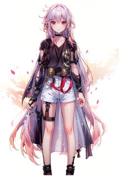 (masterpiece:1.3),(the best quality:1.2),(super fine illustrations:1.2),(Masterpiece),high quality,high detail,(white background:1.2),looking at viewer,(SOLO:1.4),outline,simple background, white_shorts, hair_between_eyes,  fu_hua, cowboy_shot, belt, black_shirt, ,pink_hair,white_hair,multicolored_hair,red_hair,red_eyes