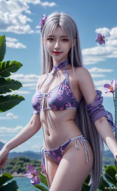 (Good structure), HDR, UHD, 8K, A real person, Highly detailed, best quality, masterpiece, 1girl, realistic, Highly detailed, (EOS R8, 50mm, F1.2, 8K, RAW photo:1.2), ultra realistic 8k, (best illumination, best shadow, extremely delicate and beautiful), (official art, beautiful and aesthetic:1.2), solo, 1girl, , long hair, Wind, flowing hair, kind smile, , pose for picture, Dynamic pose, looking_at_viewer, , perfect body, ,,(Floating flower),flowers, Blue sky and white clouds, beach,outdoor, tiandunv,white_hair,bikini