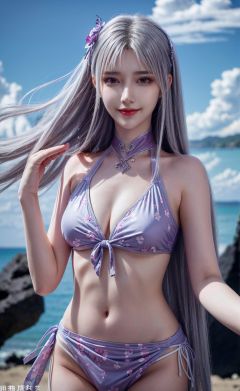 (Good structure), HDR, UHD, 8K, A real person, Highly detailed, best quality, masterpiece, 1girl, realistic, Highly detailed, (EOS R8, 50mm, F1.2, 8K, RAW photo:1.2), ultra realistic 8k, (best illumination, best shadow, extremely delicate and beautiful), (official art, beautiful and aesthetic:1.2), solo, 1girl, , long hair, Wind, flowing hair, kind smile, , pose for picture, Dynamic pose, looking_at_viewer, , perfect body, ,,(Floating flower),flowers, Blue sky and white clouds, beach,outdoor, tiandunv,white_hair,bikini