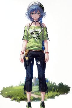 (masterpiece:1.3),(the best quality:1.2),(super fine illustrations:1.2),(Masterpiece),high quality,high detail,(white background:1.2),looking at viewer,(SOLO:1.4),outline,simplebackground,, belt,shorts,bag,shoes,off shoulder,watch,choker,sunglasses,button badge,collarbone,t-shirt,multicolored hair,black choker,black pants,wristband,off-shoulder shirt,bangs,hair flaps,hair between eyes,grey hair,fu hua,green shirt,sneakers,short sleeves,