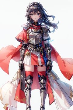 (masterpiece:1.3),(the best quality:1.2),(super fine illustrations:1.2),(Masterpiece),high quality,high detail,(white background:1.2),looking at viewer,(SOLO:1.4),outline,simple background,, pauldrons,thighhighs,breastplate,red cape,red skirt,blue eyes,hair_between_eyes,fu_hua,long hair,shoulder armor,armor,shoulder_armor, shoulder_armor