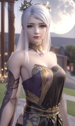 masterpiece,(best quality),(3d)official art, extremely detailed cg 8k wallpaper,((crystalstexture skin)), (extremely delicate and beautiful),highly detailed,1girl,solo,long hair,headwear,(standing),(white hair),(closed mouth),(looking at the audience:1.3),(Facing the camera:1.3),dress,chinese_clothes,china_dress,lips,clothing_cutout,hand,(Outdoor, night,moon),((looking_at_viewer)), (cleavage, medium breasts), (upper body), <lora:hipoly3DModelLora_v10:0.3> <lora:枫岫-大主宰-骆璃01:0.7>