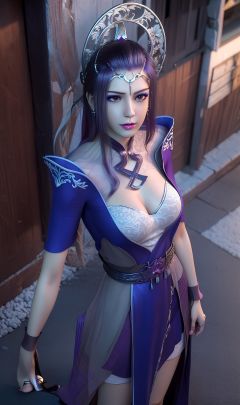 masterpiece,(best quality),(3d)official art, extremely detailed cg 8k wallpaper,((crystalstexture skin)), (extremely delicate and beautiful),highly detailed,1girl,solo,long hair,headwear,(standing),(purple hair),(closed mouth),makeup,jewelry,earrings,legs,dress,chinese_clothes,magic_circl,(Outdoor, Street, Sunny),looking_at_viewer, (cleavage, medium breasts), (upper body), <lora:hipoly3DModelLora_v10:0.3> <lora:枫岫-少年歌行-月姬04:0.75>