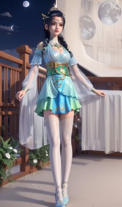 masterpiece,(best quality),(3d)official art, extremely detailed cg 8k wallpaper,((crystalstexture skin)), (extremely delicate and beautiful),highly detailed,1girl,solo,long hair,headwear,(standing),(black hair),hair_ornament,bare_shoulders,detached_sleeves,jewelry,makeup,blue dress,skirt,braid,long_sleeves,dress,thighhighs,shoes,(Outdoor, night,moon),looking_at_viewer, (cleavage, medium breasts), (full body), <lora:hipoly3DModelLora_v10:0.3>
