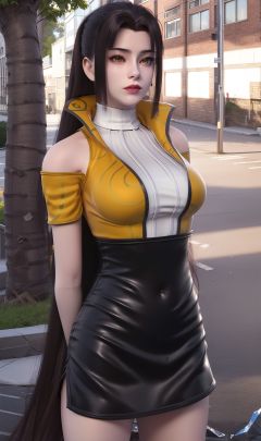 masterpiece,(best quality),(3d)official art, extremely detailed cg 8k wallpaper,((crystalstexture skin)), (extremely delicate and beautiful),highly detailed,1girl,solo,long hair,headwear,(standing),( hair),(closed mouth),dress,skirt,(Outdoor, Street, Sunny),(arms behind back)looking_at_viewer, (cleavage, medium breasts), (upper body), <lora:hipoly3DModelLora_v10:0.3> <lora:枫岫-我捡起了一地属性-苍老师03:0.75>