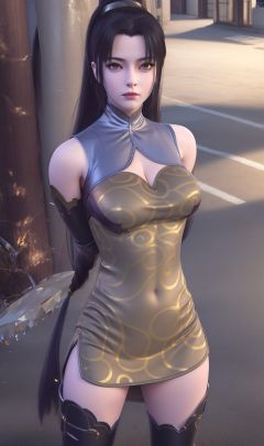 masterpiece,(best quality),(3d)official art, extremely detailed cg 8k wallpaper,((crystalstexture skin)), (extremely delicate and beautiful),highly detailed,1girl,solo,long hair,headwear,(standing),( hair),(closed mouth),dress,skirt,thighhighs,boots,(Outdoor, Street, Sunny),(arms behind back)looking_at_viewer, (cleavage, medium breasts), (upper body), <lora:hipoly3DModelLora_v10:0.3> <lora:枫岫-我捡起了一地属性-苍老师(战斗服)01 :0.75>
