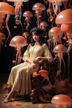 masterpiece,best quality,1girl,<lora:20231020-1697759915355-0009:0.6>,((jellyfish)),((full body)),wearing a beret,a woman sitting in a chair with a lot of lights behind her and a lot of lanterns behind her,Chen Chun,classical painting,a painting,fantasy artbest quality,masterpiece,realistic,masterpiece,Highly detailed,extreme detail description,