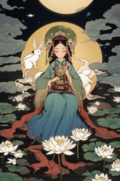 masterpiece,best quality,8K,HDR,exquisite details,1girl,<lora:Chinese Gongbi painting-000003:0.6>,goddess zi on the moon flying near the pond with some lotus flowers,Holding a white rabbit,in the style of harmonious color palette,multilayered compositions,detailed character design,nightmarish illustrations,light amber and green,traditional costumes,vibrant murals,