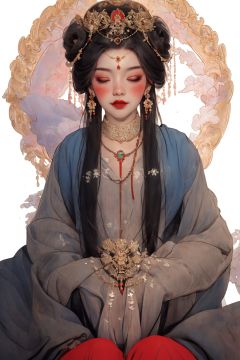 masterpiece,best quality,8K,HDR,exquisite details,<lora:Chinese Gongbi painting-000008:0.6>,Rock grRock grain feel style,rockiness,High saturation color,Ink painting style,Chinese Gongbi painting style,Chinese rock painting,1girl,solo,beads,jewelry,flower,hair ornament,long sleeves,long hair,closed eyes,black hair,updo,tassel,necklace,bead necklace,wide sleeves,makeup,hair flower,upper body,chinese clothes,pillarboxed,closed mouth,white background,blush,forehead mark,hair bun,facial mark,border,red lips,earrings,sidelocks,sitting,hanfu,lipstick,gem,shawl,full body,