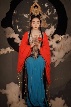 masterpiece,best quality,8K,HDR,exquisite details,<lora:Chinese Gongbi painting-000009:0.7>,Rock grain feel style,rockiness,High saturation color,Ink painting style,Chinese Gongbi painting style,Chinese rock painting,1girl,solo,black hair,closed eyes,long hair,hair ornament,sitting,flower,hanfu,chinese clothes,long sleeves,very long hair,red lips,hair flower,holding,forehead mark,makeup,wide sleeves,circle,facial mark,moon,cloud,((full body)),bird,red flower,lipstick,jewelry,