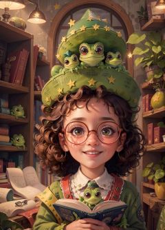 kate,\(style\),Flat style, hand drawn illustration, pencil pastel, children's picture book style,A lovely little girl, with a green hat, round red eyes, curly blond hair, a smile, a red suspender skirt, holding a blue grimoire, red glasses,little stars, big green eyes, three little lizards, and a glow, quality,High Quality,realistic,RAW photo,masterpiece,8k,insane details,High detail,hyperdetailed,Lighting,Master Lighting,film grain,flower <lora:kate P-000007:0.5>, (best quality),((masterpiece)),(highres), original, extremely detailed 8K wallpaper,(an extremely delicate and beautiful),
