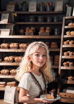 kate,\(style\),Flat style, hand drawn illustration, pencil pastel, children's picture book style,Girl, brown skin, big blue eyes, smiling, wearing a white T-shirt, blue suspenders skirt, long white hair, red headband, holding a white plate, bread, a small mouse on the plate, in the bakery, all kinds of bread and cake, best quality,High Quality,realistic,RAW photo,masterpiece,8k,insane details,High detail,hyperdetailed,Lighting,Master Lighting,film grain,flower <lora:kate P-000008:0.7>, (best quality),((masterpiece)),(highres), original, extremely detailed 8K wallpaper,(an extremely delicate and beautiful),