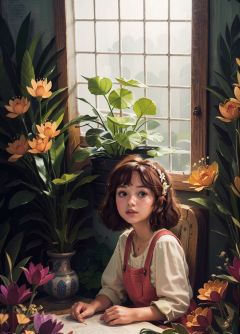 kate,\(style\),Flat style, hand drawn illustration, pencil pastel, children's picture book style,Beautiful girl, brown short hair, red big bow hair clip, green half sleeve, pink slip dress, probe from the window, florist, all kinds of beautiful flowers, plants, outdoor with big trees,, best quality,High Quality,realistic,RAW photo,masterpiece,8k,insane details,High detail,hyperdetailed,Lighting,Master Lighting,film grain,flower <lora:kate P-000007:0.7>, (best quality),((masterpiece)),(highres), original, extremely detailed 8K wallpaper,(an extremely delicate and beautiful),