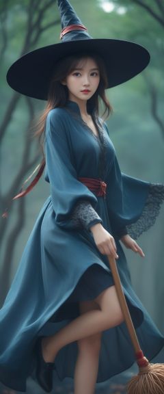 masterpiece, best quality, official art, extremely detailed CG unity 8k wallpaper, exposure blend, medium shot, bokeh, (hdr:1.4), high contrast, (cinematic), (muted colors, dim colors, soothing tones:1.3), natural external halo, excellent color and light effects, (color deviation, color deviation, color reproduction: 1.1) , 1 chinese girl, ((full_body)), Witch costume, riding a broomstick, flying in the sky, night, Halloween