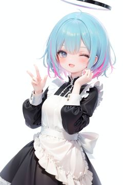 1girl, solo, apron, halo, hair over one eye, closed eyes, smile, white background, dress, white apron, simple background, long sleeves, multicolored hair, braid, open mouth, blue hair, alternate costume, blush, bangs, :d, pink hair, black dress, ribbon, frilled dress, enmaided, short hair, hand up, colored inner hair