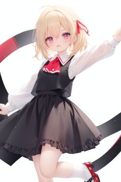 1girl, rumia, blonde hair, solo, white background, red eyes, red footwear, simple background, ascot, short hair, ribbon, open mouth, hair ribbon, smile, long sleeves, shirt, looking at viewer, red ascot, white socks, white shirt, red ribbon, shoes, socks, frills, bangs, outstretched arms, hair between eyes, skirt, :d, dress, vest, mary janes, black dress, black skirt, collared shirt, black vest, blush