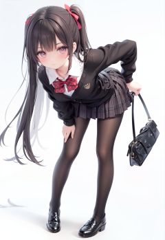1girl, solo, pantyhose, skirt, long hair, loafers, shoes, simple background, school uniform, brown eyes, plaid, black pantyhose, plaid skirt, looking at viewer, black hair, pantyhose pull, full body, clothes pull, black footwear, pleated skirt, leaning forward, bangs, long sleeves, bent over, cardigan, bow, bowtie, standing, closed mouth, pulled by self, grey background, blush, miniskirt, red bow, sweater, **********