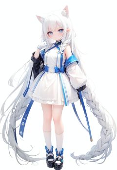 1girl, white_gloves, braid, full_body, gloves, long_hair, official_alternate_costume, pointy_ears, simple_background, solo, standing, very_long_hair, white_background, white hair, blue eyes, paw claw pose, open_mouth