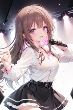 1girl, solo, microphone, smile, skirt, blush, brown eyes, long hair, open mouth, looking at viewer, brown hair, long sleeves, :d, shirt, bangs, belt, breasts, pink shirt, outstretched arm, music, black belt, medium breasts, holding microphone, singing