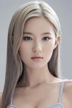 (8k, best quality, masterpiece, ), ultra detailed illustration, extremely detailed face, RAW photo, film grain, skin pores, warm light, cleavage, 1girl, solo, realistic, sky blue eyes, long hair, looking at viewer, lips, simple background, grey background, full shot, blonde hair, hair, **** top, closed mouth, nose