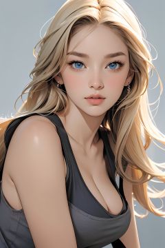 (8k, best quality, masterpiece, ), ultra detailed illustration, extremely detailed face, RAW photo, film grain, skin pores, warm light, cleavage, 1girl, solo, realistic, sky blue eyes, long hair, looking at viewer, lips, simple background, grey background, full shot, blonde hair, hair, **** top, closed mouth, nose