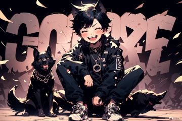 Larme Kei3, 1 boy, one eye closed, black hair, male focus, coat, blue eyes, animal ears, open mouth, black jacket, smiling, dog, shirt, looking at audience, pants, wolf, long sleeves, sitting, short hair, teeth, solo, necklace<lora:Larme Kei_20231031093831-000012:1>
