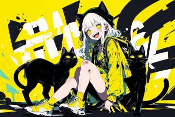 Larme Kei3, 1girl, long hair, backpack, white hair, cat, cat ears, socks, single, long sleeves, green hair, black cat, yellow eyes, pleated skirt, looking at the viewer, open mouth, english text, band-aid, jacket, hat, green dress, yellow dress with bangs, multicolored hair, turban<lora:Larme Kei_20231031093831-000012:1>