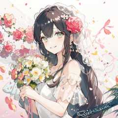 (masterpiece:1.2), best quality,PIXIV,Sweet girl portrait,1girl, solo, flower, veil, bouquet, dress, smile, pink flower, brown hair, holding, holding bouquet, wedding dress, bridal veil, looking at viewer, blush, bare shoulders, white dress, grin, signature, off shoulder, hair ornament, petals, grey eyes, rose, upper body, pink rose, white background, off-shoulder dress, branch, hair flower, white flower, bangs, bride, green eyes, collarbone <lora:Sweet girl portrait_20231030170647-000018:1>