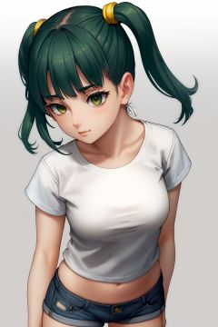 1girl, ass, ass_support, golden_eyes, dark_green_hair, blush, breasts, eyebrows_visible_through_hair, from_above, grey_background, denim_shorts, white t-shirt, looking_at_viewer, long_twintails, simple_background, skin_tight, solo, thigh_gap, 1girl, **** girls, navel, (lending_forward:1.4), as109,