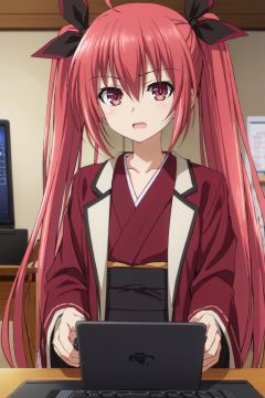 1girl, solo, red hair, long hair, twintails, red eyes, open mouth, ribbon, ahoge, hair ribbon, jacket on shoulders, collarbone, black ribbon, computer, jacket, hair between eyes, looking at viewer, upper body, laptop, japanese clothes, kimono, bangs<lora:taotingyuanhdLycoris:0.3:lbw=NF>,<lora:detolovehdLycoris:0.6>,