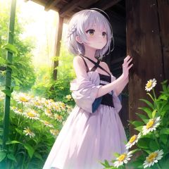 yellow theme,the setting sun,(((Chamomile))),Chamomile,cornflower,vines,forest,ruins,lens flare,hdr,Tyndall effect,damp,wet,1girl,bare shoulders,broken glass,broken wall,white hair,white dress,closed mouth,constel lation,flat color,braid,white robe,float,closed mouth,constel lation,flat color,looking up,standing,medium hair,standing,solo,