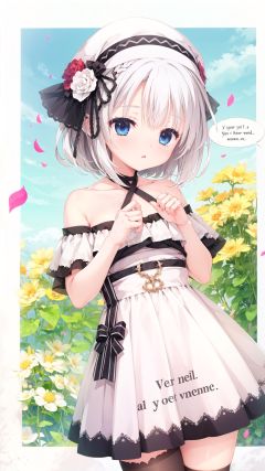 absurdres, absolutely resolution, incredibly absurdres, highres, ultra detailed, official art, unity 8k wallpaper, Kinetic Typography BREAK (1girl, solo:1.4), beautiful and shiny skin, coquettish skin, dynamic poses, dynamic angle, close-up, cowboy shot BREAK (standding, short white hair, beautiful blue eyes:1.2) BREAK (strapless dress, beautiful plunging neckline , belts, leg loops, flower headdress, thighhighs:1.2) BREAK (off shoulder, bare shoulders, bare arms:1.2) BREAK (flower, rose, garden, petal:1.2) BREAK (white theme, english text, border:1.6) BREAK nice hands, perfect hands,