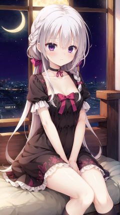 1girl, solo, purple eyes, sitting, long hair, moon, dress, short sleeves, night, braid, looking at viewer, crescent moon, bangs, white hair, socks, hair between eyes, choker, frilled dress, very long hair, frills, kneehighs, closed mouth, blush, black socks, puffy sleeves, bug, tears, puffy short sleeves, butterfly, window, black dress, sky, between legs, night sky, hand between legs, feet out of frame, french braid, sidelocks, collarbone, black choker, bow, indoors