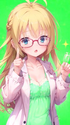 1girl, blonde hair, solo, glasses, long hair, blue eyes, labcoat, holding, bottle, open mouth, looking at viewer, ahoge, collarbone, red-framed eyewear, upper body, polka dot, bangs, pointing, blush, polka dot background, long sleeves, camisole, shiny, :o, sparkle, green shirt, pointing at viewer