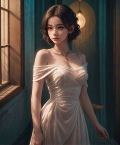 Best quality, masterpiece, ultra high res, photographic of 1 girl, close up, ethereal beauty, elegant off-shoulder dress, mysterious ambiance, obscured silhouette, dimly lit, alluring look, chic bob hairstyle, BJ_Lego bricks, FilmGirl, dlwlrma, enakorin, radiant glow on face, enchanted realm, watercolor,cinematic lighting, light master