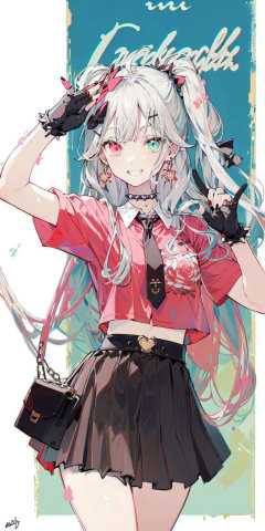 (masterpiece:1.2), best quality,PIXIV,Sweet girl ,1girl, solo, long hair, smile, skirt, gloves, heterochromia, hair ornament, fingerless gloves, bow, hair bow, jewelry, black gloves, plaid skirt, multicolored hair, fishnets, looking at viewer, shirt, plaid, earrings, black bow, nail polish, belt, heart, red shirt, short sleeves, grin, crop top, single glove, bangs, red skirt, cowboy shot, arms up, bandages, hairclip, choker, ahoge, black nails, signature, pink eyes, necktie, bandaged arm, very long hair, spikes, midriff, collar, pleated skirt, black choker, black necktie, pink hair, polka dot, blush, ear piercing, miniskirt, grey eyes, grey hair, piercing, hands up, multicolored nails, heart hair ornament, streaked hair, black collar, black belt, white hair, red eyes, red nails, frills, safety pin, x hair ornament, ring, breasts, buckle, badge, chain, spiked bracelet, character name, bracelet <lora:Sweet girl p_20231030174934-000018:0.8>
