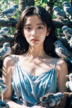 (Masterpiece, best quality, high-resolution: 1.2), (upper body), 1 girl, blue floral dress. Solo, (surrounded by 20 birds), powder blusher, smoky makeup, lipstick, diamond necklace, black hair, long black hair, flowers, trees, 20 identical birds sleep together, squeeze each other, squint. Foreground occlusion, portrait, depth of field, looking at the audience, slow motion, rose, retro, anatomical correctness, best quality, movie lighting