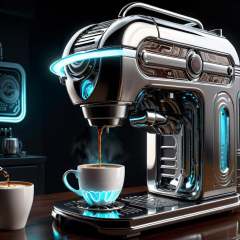 chrometech aesthetics,  scifi chrometech  coffee machine pouring into acoffee mug,  on a table,  glowing parts,  sucface imperfections,  glowing parts,  ((best quality)),  ((masterpiece)),  ((realistic,  digital art)),  (hyper detailed),  raytracing,  volumetric lighting,  Backlit,  Rim Lighting,  HDR,  styled form,   , <lora:EMS-75928-EMS:0.800000>