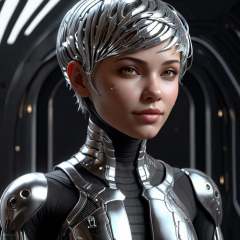 chrometech aesthetics,  scifi chrometech scholar female with a pixie cut,  glowing eyes,  light smile,  closed mouth,  from a scifi futuristic chrometech world,  sucface imperfections,  glowing parts,  ((best quality)),  ((masterpiece)),  ((realistic,  digital art)),  (hyper detailed),  raytracing,  volumetric lighting,  Backlit,  Rim Lighting,  HDR,  styled form,  natural pale skin,  upper body, <lora:EMS-75928-EMS:0.900000>