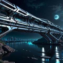 chrometech aesthetics, scifi chrometech city bridge over a river, at night, from a scifi futuristic chrometech world, sucface imperfections, glowing parts, ((best quality)), ((masterpiece)), ((realistic, digital art)), (hyper detailed), raytracing, volumetric lighting, Backlit, Rim Lighting, HDR, styled form, , <lora:EMS-75928-EMS:0.900000>