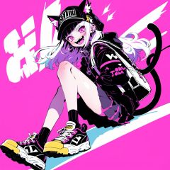 Larme Kei, 1girl, yellow eyes, shoes, jewelry, earrings, white hair, cat, long hair, socks, bag, backpack, jacket, hat, sneakers, white footwear, looking at viewer, sitting, animal ears, cat ears, solo, bangs, smile, black jacket, Larme Kei, 1girl, animal ears, skirt, black hair, cat ears, pink eyes, cat, shoes, bangs, pink theme, open mouth, solo, black skirt, blunt bangs, pleated skirt, black footwear, teeth, speaker, multicolored hair, fangs, sharp teeth, medium hair, long sleeves, pink background, collar, cat tail, tail, looking at viewer, jacket, shirt