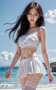 (Good structure), HDR, UHD, 8K, A real person, Highly detailed, best quality, masterpiece, 1girl, realistic, Highly detailed, (EOS R8, 50mm, F1.2, 8K, RAW photo:1.2), ultra realistic 8k, (best illumination, best shadow, extremely delicate and beautiful), (official art, beautiful and aesthetic:1.2), solo, 1girl, , Wind, flowing hair, kind smile, , pose for picture, Dynamic pose, looking_at_viewer, , perfect body, , Blue sky and white clouds, beach,outdoor, ,Swimwear Skirt,,lips,, , sunyunzhu, blackpantyhose,lace