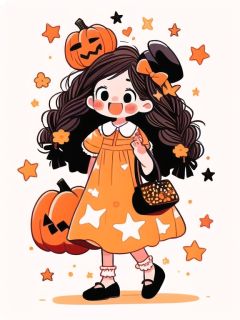 1girl, black eyes, black hair, blush, blush stickers, bow, brown hair, closed mouth, colorful, dress, flower, full body, handbag, hat, heart, long hair, looking to the side, open mouth, pumpkin, shoes, smile, socks, solo, standing, star \(symbol\), star hair ornament, tuyagirl, twin braids, white background <lora:tuyagirl:1>