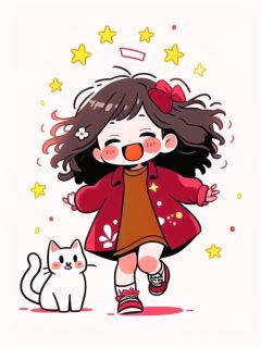 1girl, black hair, blush, blush stickers, bow, brown hair, cat, chibi, dress, facing viewer, female child, happy, jacket, leaf, long hair, long sleeves, medium hair, open coat, open mouth, print dress, red footwear, red sweater, shoes, short sleeves, sneakers, socks, solo, standing on one leg, star \(symbol\), tuyagirl, virtual youtuber, white background, white cat, white flower, yellow sweater, <lora:tuyagirl:1>