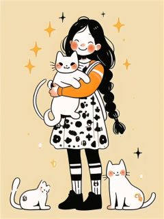 1girl, animal hug, bag, black footwear, black hair, blush, braid, cat, closed mouth, dress, floral print, limited palette, looking at viewer, pants, shoes, simple background, smile, socks, solo, sparkle, standing, striped socks, tuyagirl, <lora:tuyagirl:1>