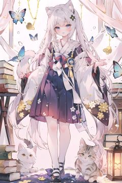 (((houraisan kaguya))), blue butterfly, butterfly, butterfly hair ornament, glowing butterfly, origami, paper crane, 1girl, long_hair, book, white hair, skirt, paper airplane, solo, book stack, very long hair, black skirt,, ginkgo leaf, blue bow, shoes,, pleated_skirt, ,flying,catgirl,cat ears,white tail,fox tail,yuzu crystal , cuteloli